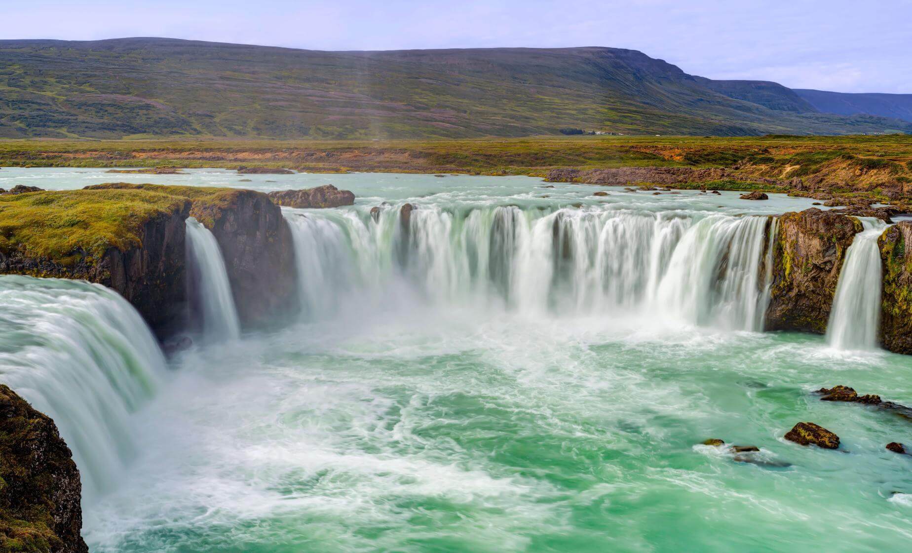 • Admire the stunning Godafoss Waterfall, where glacial waters cascade over rugged cliffs.