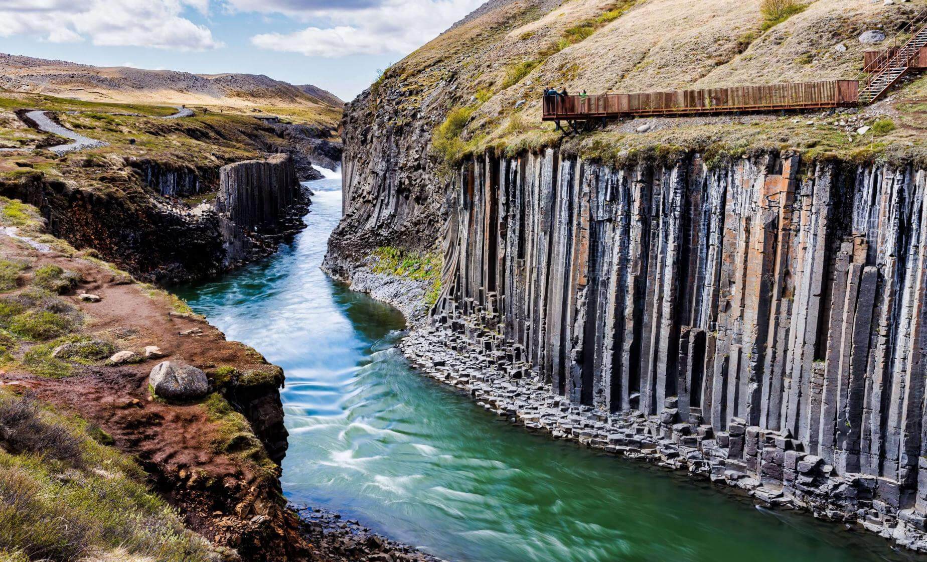 - Explore the otherworldly Studlagil Canyon, famous for its towering basalt formations and vivid glacial-blue river.